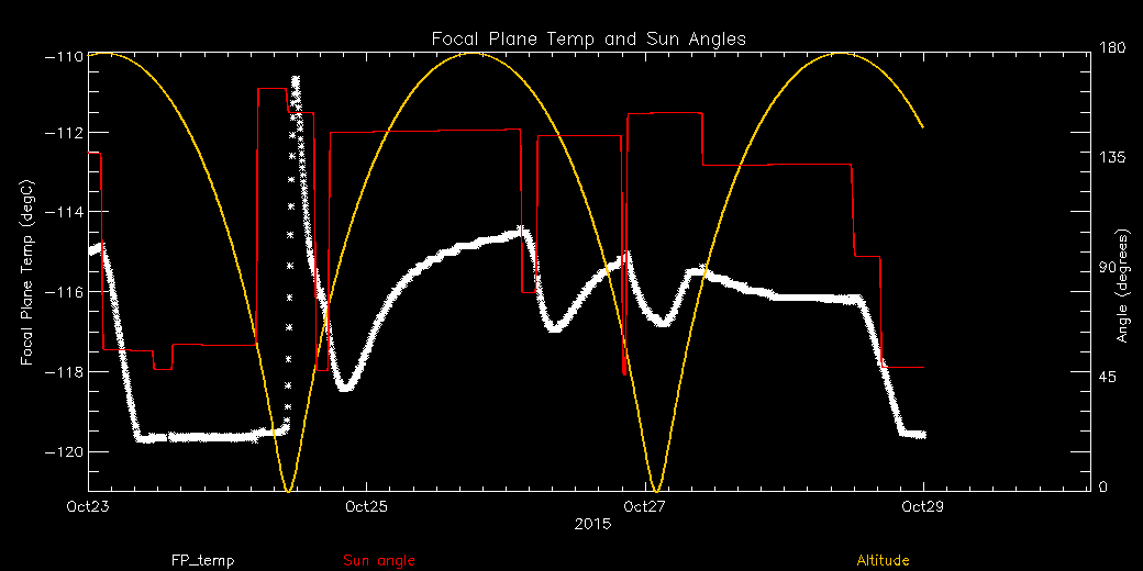 Weekly focal plane temperature with sun angle, earth angle, and altitude overplotted. Sun angle is the solar array angle, that is the angle between the sun and the optical axis (+X axis). The earth angle is the angle between earth and the ACIS radiator (+Z axis). Altitude varies from 34 kkm to 128 kkm.