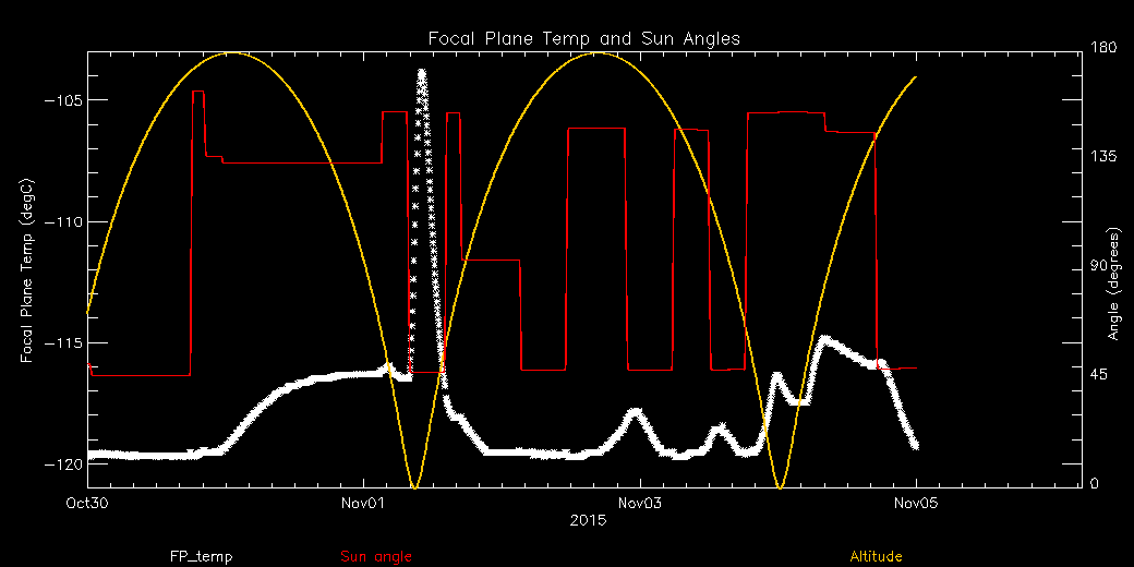 Weekly focal plane temperature with sun angle, earth angle, and altitude overplotted. Sun angle is the solar array angle, that is the angle between the sun and the optical axis (+X axis). The earth angle is the angle between earth and the ACIS radiator (+Z axis). Altitude varies from 34 kkm to 128 kkm.