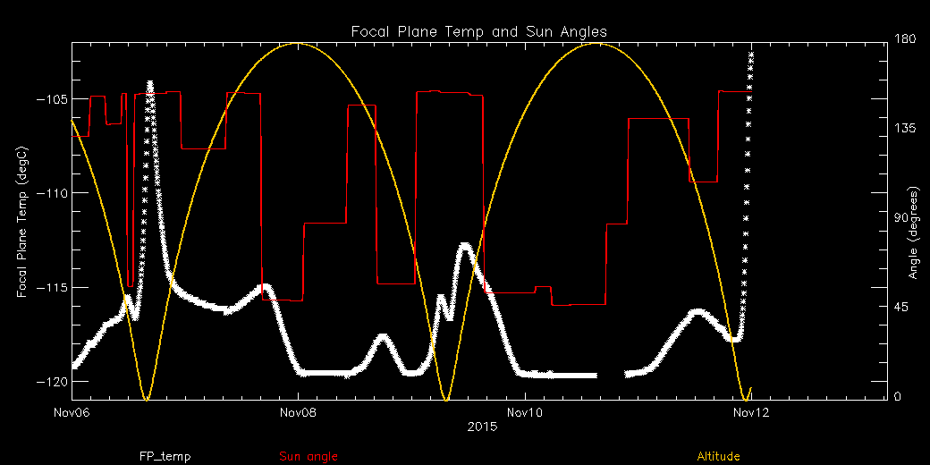 Weekly focal plane temperature with sun angle, earth angle, and altitude overplotted. Sun angle is the solar array angle, that is the angle between the sun and the optical axis (+X axis). The earth angle is the angle between earth and the ACIS radiator (+Z axis). Altitude varies from 34 kkm to 128 kkm.
