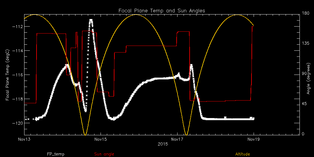 Weekly focal plane temperature with sun angle, earth angle, and altitude overplotted. Sun angle is the solar array angle, that is the angle between the sun and the optical axis (+X axis). The earth angle is the angle between earth and the ACIS radiator (+Z axis). Altitude varies from 34 kkm to 128 kkm.
