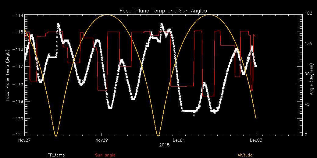 Weekly focal plane temperature with sun angle, earth angle, and altitude overplotted. Sun angle is the solar array angle, that is the angle between the sun and the optical axis (+X axis). The earth angle is the angle between earth and the ACIS radiator (+Z axis). Altitude varies from 34 kkm to 128 kkm.