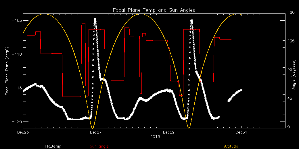 Weekly focal plane temperature with sun angle, earth angle, and altitude overplotted. Sun angle is the solar array angle, that is the angle between the sun and the optical axis (+X axis). The earth angle is the angle between earth and the ACIS radiator (+Z axis). Altitude varies from 34 kkm to 128 kkm.