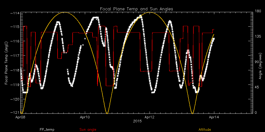 Weekly focal plane temperature with sun angle, earth angle, and altitude overplotted. Sun angle is the solar array angle, that is the angle between the sun and the optical axis (+X axis). The earth angle is the angle between earth and the ACIS radiator (+Z axis). Altitude varies from 34 kkm to 128 kkm.