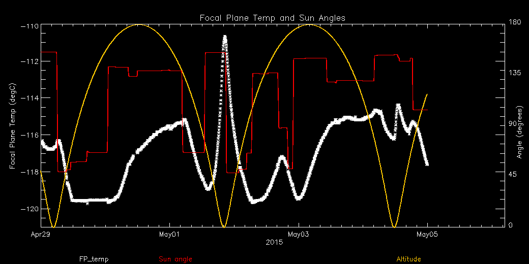 Weekly focal plane temperature with sun angle, earth angle, and altitude overplotted. Sun angle is the solar array angle, that is the angle between the sun and the optical axis (+X axis). The earth angle is the angle between earth and the ACIS radiator (+Z axis). Altitude varies from 34 kkm to 128 kkm.
