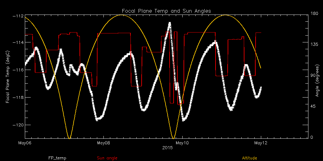 Weekly focal plane temperature with sun angle, earth angle, and altitude overplotted. Sun angle is the solar array angle, that is the angle between the sun and the optical axis (+X axis). The earth angle is the angle between earth and the ACIS radiator (+Z axis). Altitude varies from 34 kkm to 128 kkm.
