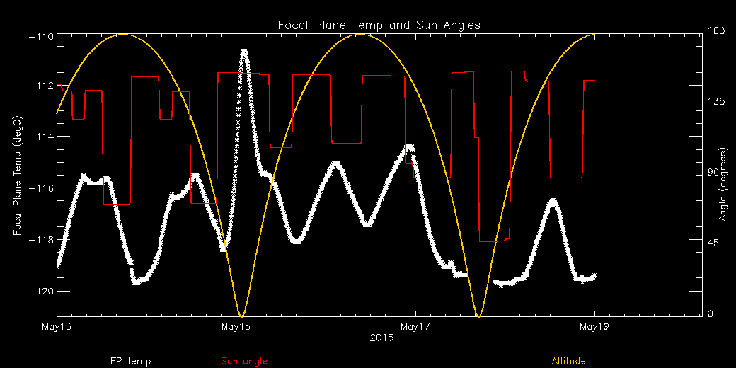 Weekly focal plane temperature with sun angle, earth angle, and altitude overplotted. Sun angle is the solar array angle, that is the angle between the sun and the optical axis (+X axis). The earth angle is the angle between earth and the ACIS radiator (+Z axis). Altitude varies from 34 kkm to 128 kkm.