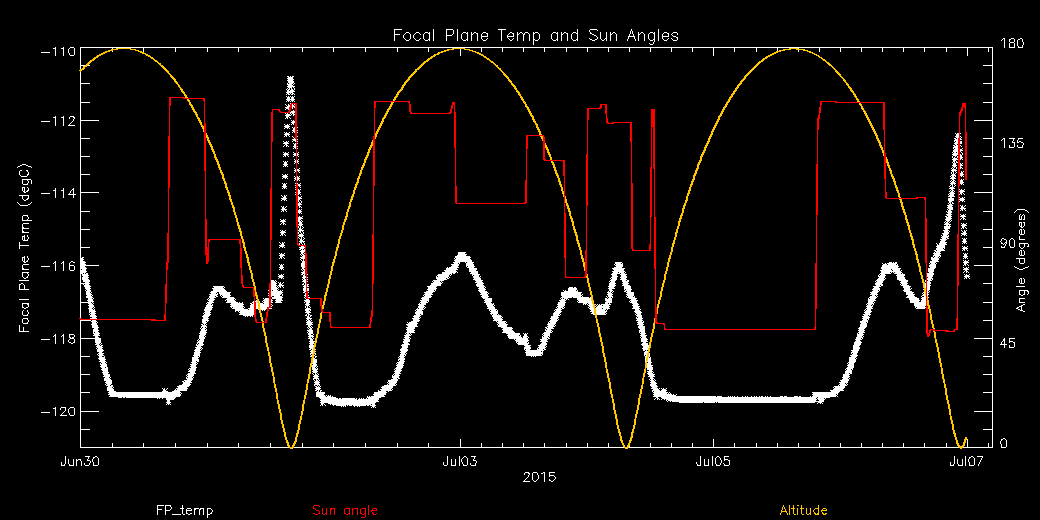 Weekly focal plane temperature with sun angle, earth angle, and altitude overplotted. Sun angle is the solar array angle, that is the angle between the sun and the optical axis (+X axis). The earth angle is the angle between earth and the ACIS radiator (+Z axis). Altitude varies from 34 kkm to 128 kkm.