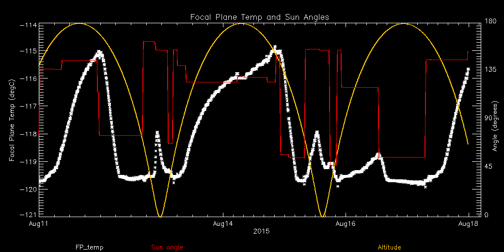 Weekly focal plane temperature with sun angle, earth angle, and altitude overplotted. Sun angle is the solar array angle, that is the angle between the sun and the optical axis (+X axis). The earth angle is the angle between earth and the ACIS radiator (+Z axis). Altitude varies from 34 kkm to 128 kkm.