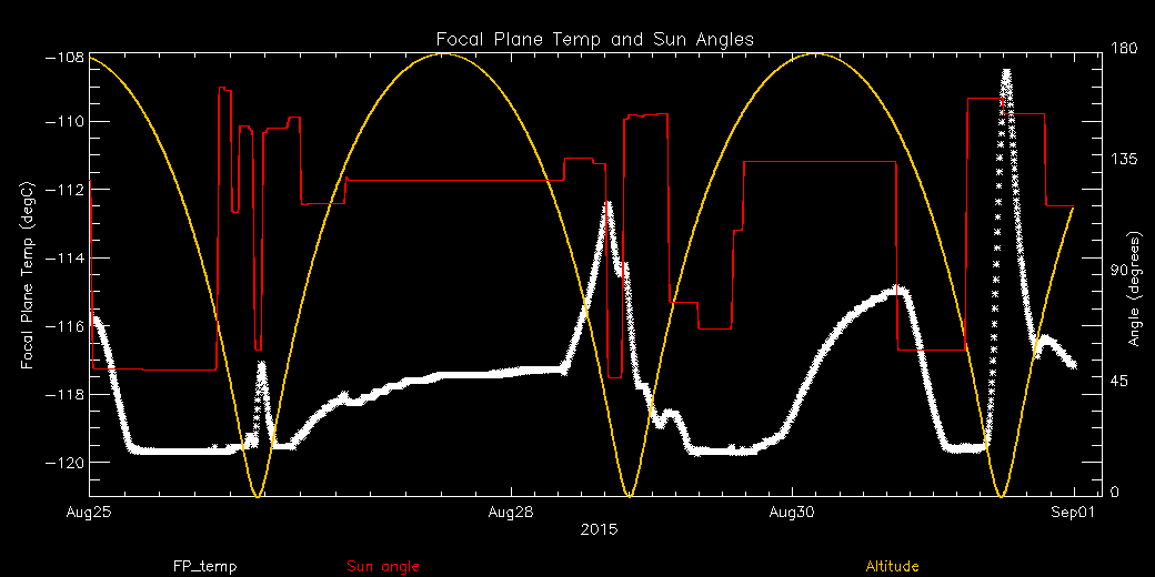 Weekly focal plane temperature with sun angle, earth angle, and altitude overplotted. Sun angle is the solar array angle, that is the angle between the sun and the optical axis (+X axis). The earth angle is the angle between earth and the ACIS radiator (+Z axis). Altitude varies from 34 kkm to 128 kkm.