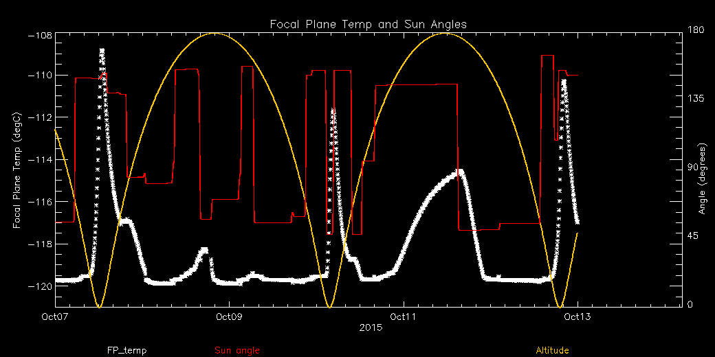 Weekly focal plane temperature with sun angle, earth angle, and altitude overplotted. Sun angle is the solar array angle, that is the angle between the sun and the optical axis (+X axis). The earth angle is the angle between earth and the ACIS radiator (+Z axis). Altitude varies from 34 kkm to 128 kkm.