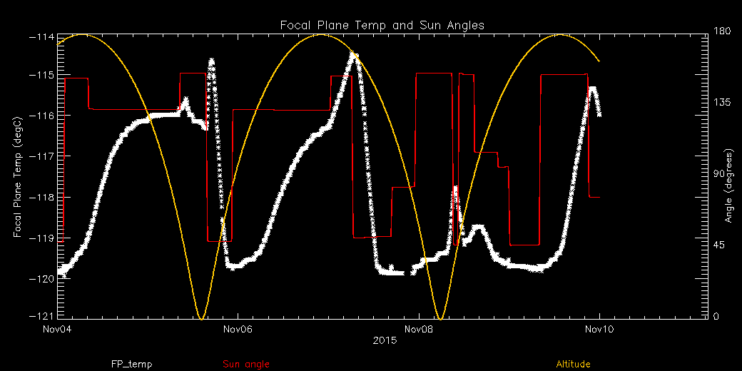 Weekly focal plane temperature with sun angle, earth angle, and altitude overplotted. Sun angle is the solar array angle, that is the angle between the sun and the optical axis (+X axis). The earth angle is the angle between earth and the ACIS radiator (+Z axis). Altitude varies from 34 kkm to 128 kkm.