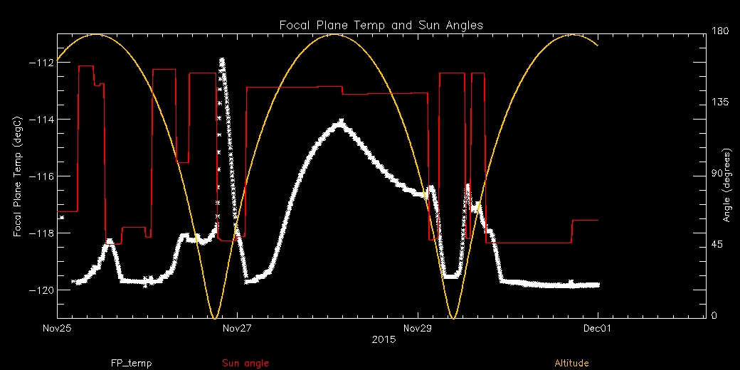 Weekly focal plane temperature with sun angle, earth angle, and altitude overplotted. Sun angle is the solar array angle, that is the angle between the sun and the optical axis (+X axis). The earth angle is the angle between earth and the ACIS radiator (+Z axis). Altitude varies from 34 kkm to 128 kkm.