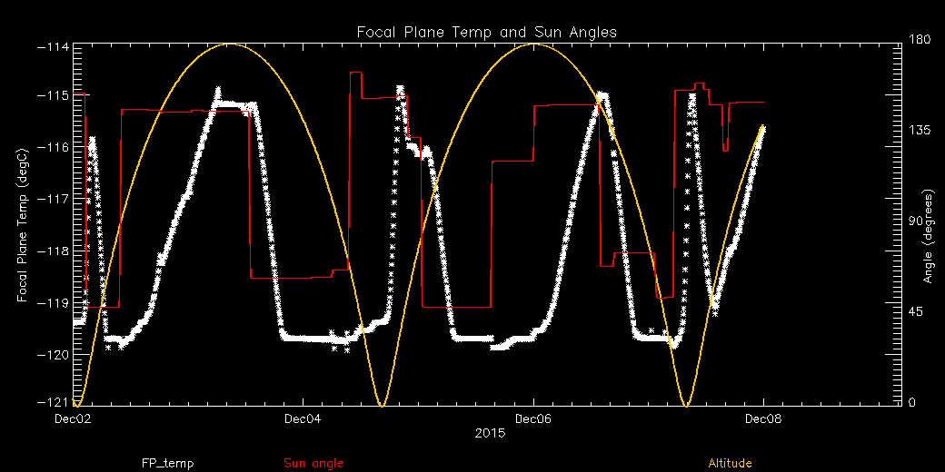 Weekly focal plane temperature with sun angle, earth angle, and altitude overplotted. Sun angle is the solar array angle, that is the angle between the sun and the optical axis (+X axis). The earth angle is the angle between earth and the ACIS radiator (+Z axis). Altitude varies from 34 kkm to 128 kkm.