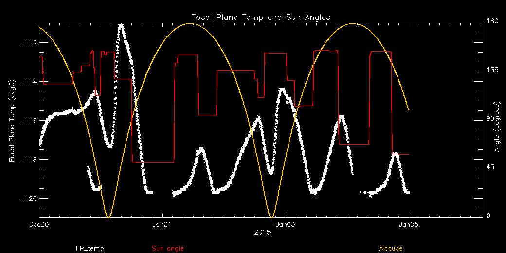Weekly focal plane temperature with sun angle, earth angle, and altitude overplotted. Sun angle is the solar array angle, that is the angle between the sun and the optical axis (+X axis). The earth angle is the angle between earth and the ACIS radiator (+Z axis). Altitude varies from 34 kkm to 128 kkm.