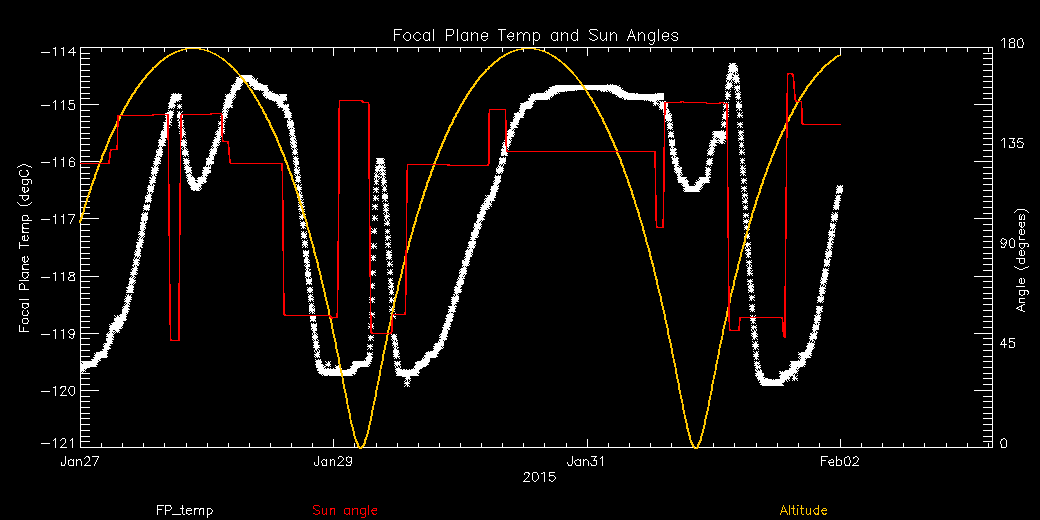 Weekly focal plane temperature with sun angle, earth angle, and altitude overplotted. Sun angle is the solar array angle, that is the angle between the sun and the optical axis (+X axis). The earth angle is the angle between earth and the ACIS radiator (+Z axis). Altitude varies from 34 kkm to 128 kkm.