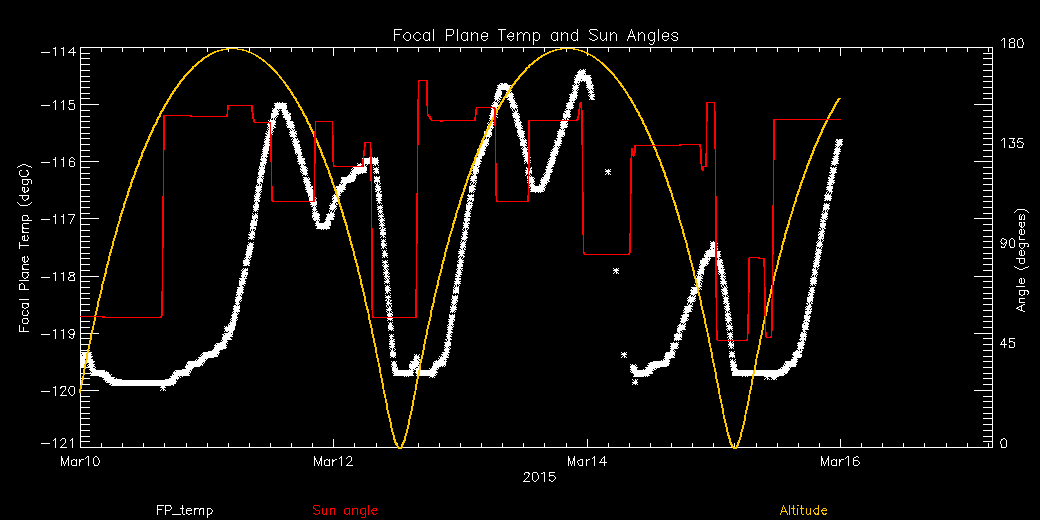Weekly focal plane temperature with sun angle, earth angle, and altitude overplotted. Sun angle is the solar array angle, that is the angle between the sun and the optical axis (+X axis). The earth angle is the angle between earth and the ACIS radiator (+Z axis). Altitude varies from 34 kkm to 128 kkm.