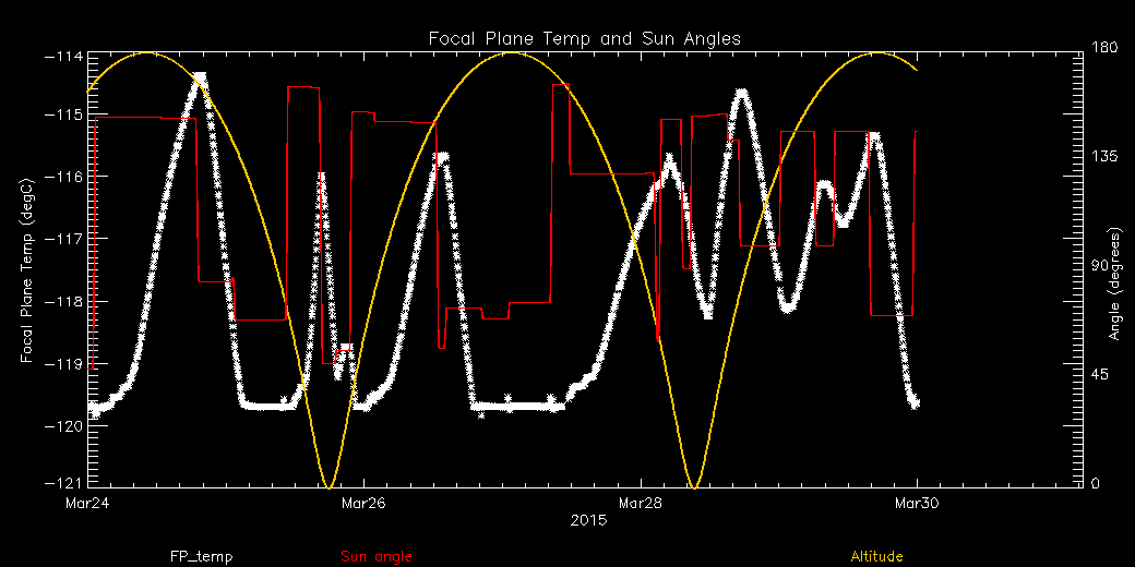 Weekly focal plane temperature with sun angle, earth angle, and altitude overplotted. Sun angle is the solar array angle, that is the angle between the sun and the optical axis (+X axis). The earth angle is the angle between earth and the ACIS radiator (+Z axis). Altitude varies from 34 kkm to 128 kkm.