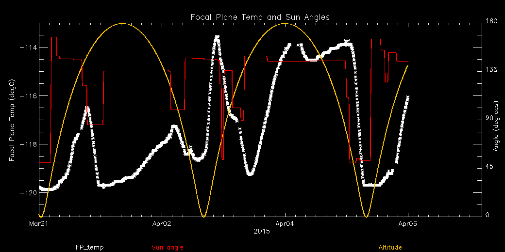 Weekly focal plane temperature with sun angle, earth angle, and altitude overplotted. Sun angle is the solar array angle, that is the angle between the sun and the optical axis (+X axis). The earth angle is the angle between earth and the ACIS radiator (+Z axis). Altitude varies from 34 kkm to 128 kkm.