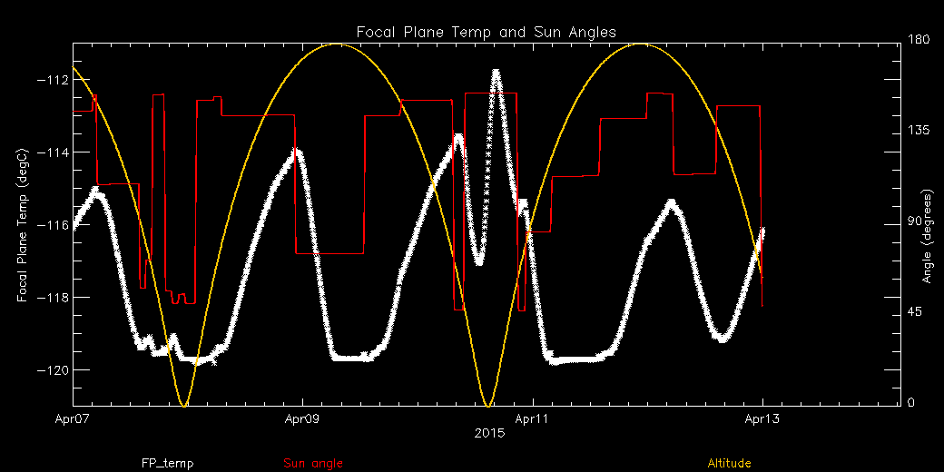 Weekly focal plane temperature with sun angle, earth angle, and altitude overplotted. Sun angle is the solar array angle, that is the angle between the sun and the optical axis (+X axis). The earth angle is the angle between earth and the ACIS radiator (+Z axis). Altitude varies from 34 kkm to 128 kkm.