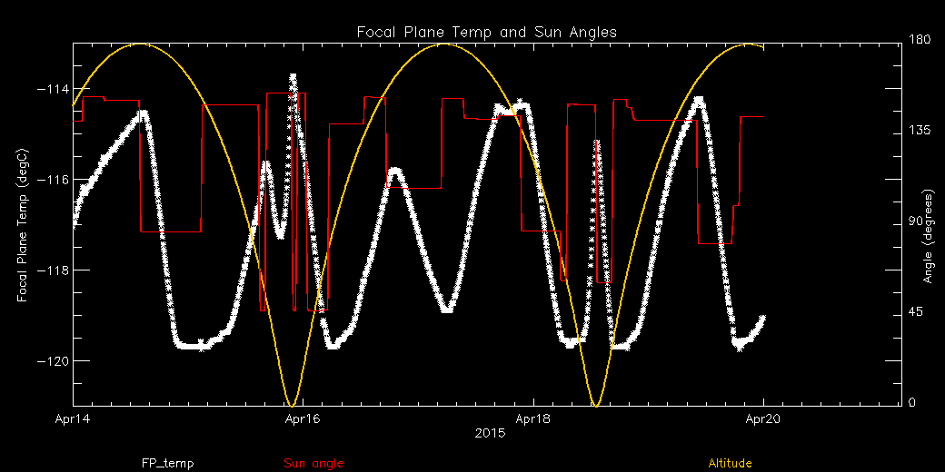 Weekly focal plane temperature with sun angle, earth angle, and altitude overplotted. Sun angle is the solar array angle, that is the angle between the sun and the optical axis (+X axis). The earth angle is the angle between earth and the ACIS radiator (+Z axis). Altitude varies from 34 kkm to 128 kkm.