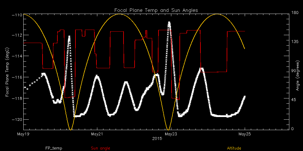 Weekly focal plane temperature with sun angle, earth angle, and altitude overplotted. Sun angle is the solar array angle, that is the angle between the sun and the optical axis (+X axis). The earth angle is the angle between earth and the ACIS radiator (+Z axis). Altitude varies from 34 kkm to 128 kkm.