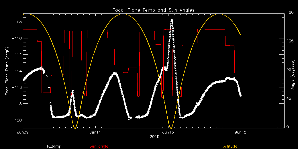 Weekly focal plane temperature with sun angle, earth angle, and altitude overplotted. Sun angle is the solar array angle, that is the angle between the sun and the optical axis (+X axis). The earth angle is the angle between earth and the ACIS radiator (+Z axis). Altitude varies from 34 kkm to 128 kkm.