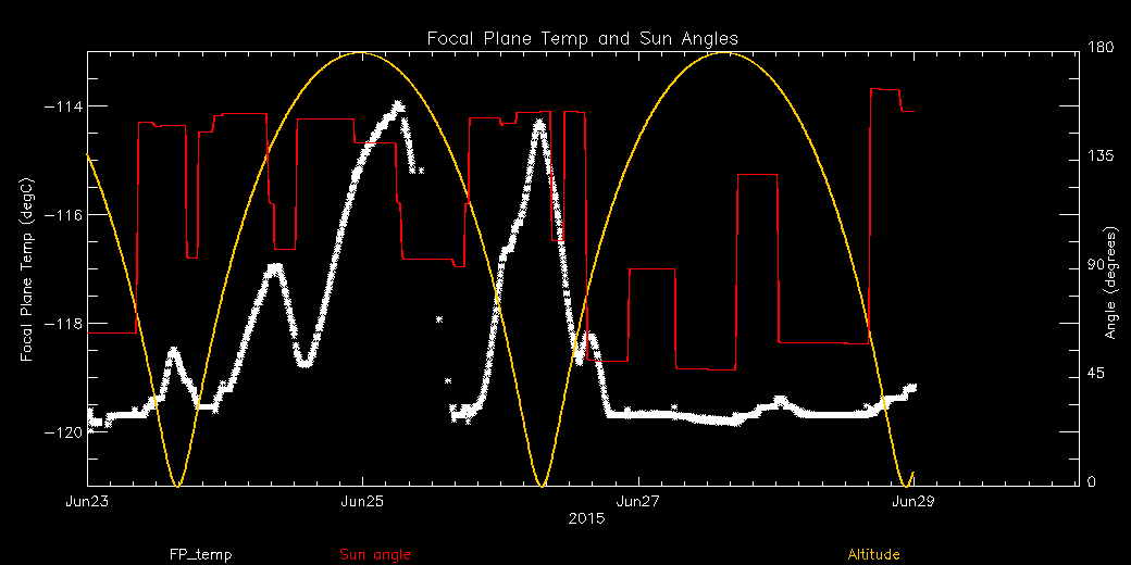 Weekly focal plane temperature with sun angle, earth angle, and altitude overplotted. Sun angle is the solar array angle, that is the angle between the sun and the optical axis (+X axis). The earth angle is the angle between earth and the ACIS radiator (+Z axis). Altitude varies from 34 kkm to 128 kkm.