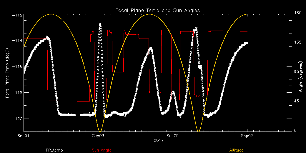 Weekly focal plane temperature with sun angle, earth angle, and altitude overplotted. Sun angle is the solar array angle, that is the angle between the sun and the optical axis (+X axis). The earth angle is the angle between earth and the ACIS radiator (+Z axis). Altitude varies from 34 kkm to 128 kkm.