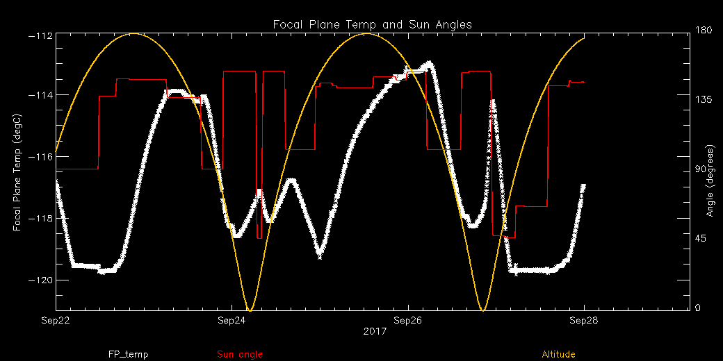 Weekly focal plane temperature with sun angle, earth angle, and altitude overplotted. Sun angle is the solar array angle, that is the angle between the sun and the optical axis (+X axis). The earth angle is the angle between earth and the ACIS radiator (+Z axis). Altitude varies from 34 kkm to 128 kkm.