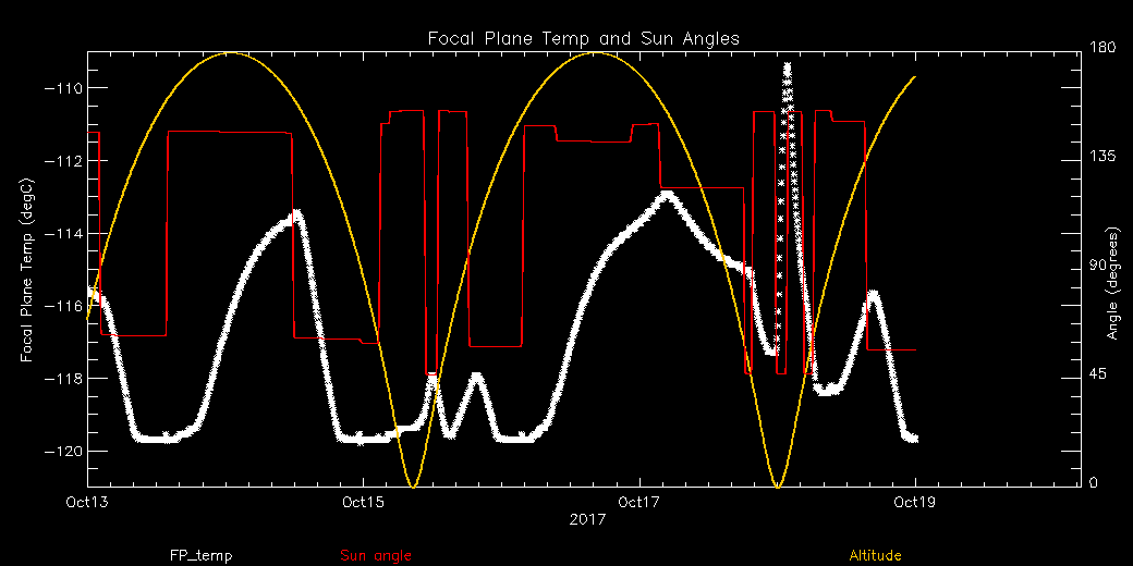 Weekly focal plane temperature with sun angle, earth angle, and altitude overplotted. Sun angle is the solar array angle, that is the angle between the sun and the optical axis (+X axis). The earth angle is the angle between earth and the ACIS radiator (+Z axis). Altitude varies from 34 kkm to 128 kkm.