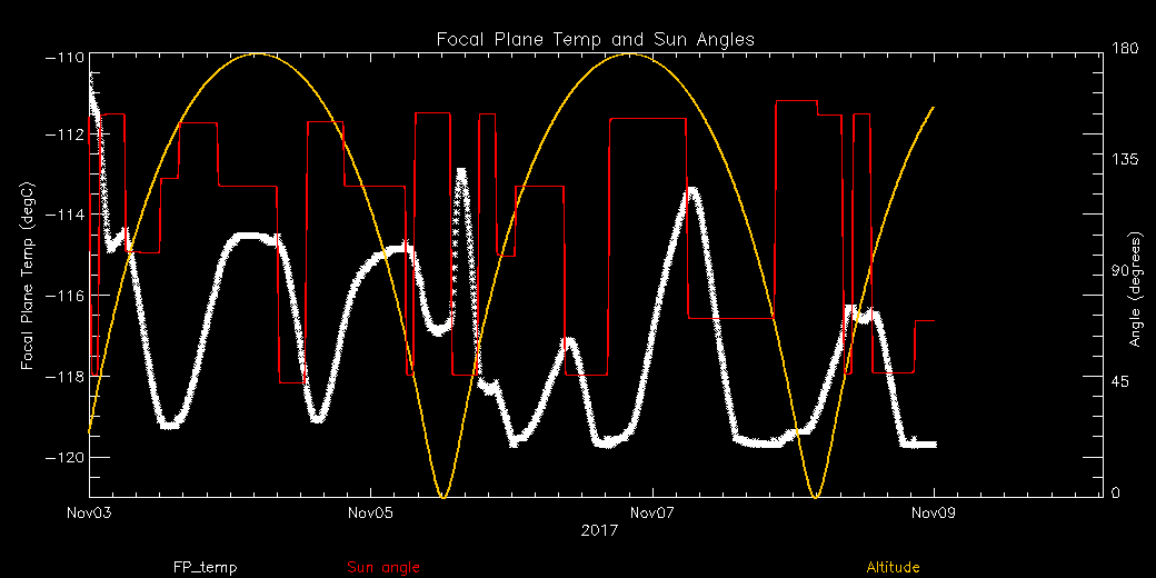 Weekly focal plane temperature with sun angle, earth angle, and altitude overplotted. Sun angle is the solar array angle, that is the angle between the sun and the optical axis (+X axis). The earth angle is the angle between earth and the ACIS radiator (+Z axis). Altitude varies from 34 kkm to 128 kkm.