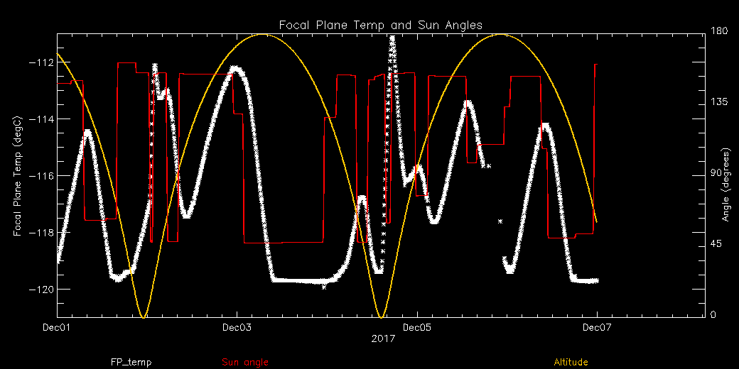 Weekly focal plane temperature with sun angle, earth angle, and altitude overplotted. Sun angle is the solar array angle, that is the angle between the sun and the optical axis (+X axis). The earth angle is the angle between earth and the ACIS radiator (+Z axis). Altitude varies from 34 kkm to 128 kkm.