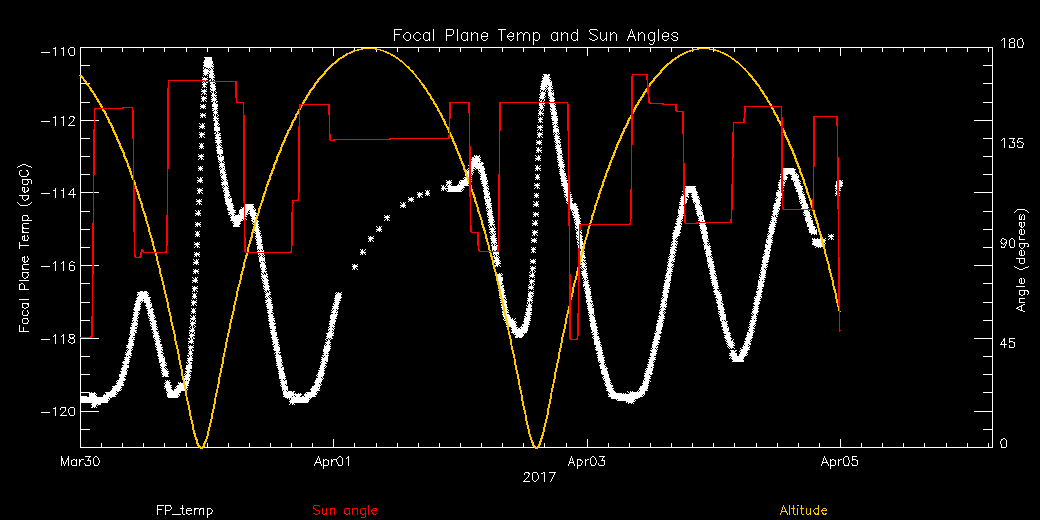 Weekly focal plane temperature with sun angle, earth angle, and altitude overplotted. Sun angle is the solar array angle, that is the angle between the sun and the optical axis (+X axis). The earth angle is the angle between earth and the ACIS radiator (+Z axis). Altitude varies from 34 kkm to 128 kkm.