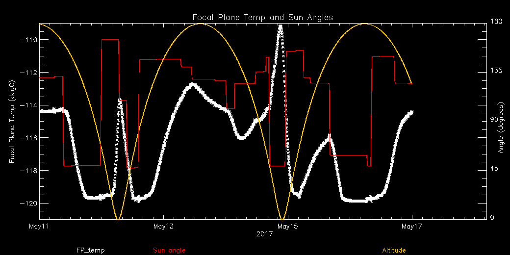 Weekly focal plane temperature with sun angle, earth angle, and altitude overplotted. Sun angle is the solar array angle, that is the angle between the sun and the optical axis (+X axis). The earth angle is the angle between earth and the ACIS radiator (+Z axis). Altitude varies from 34 kkm to 128 kkm.