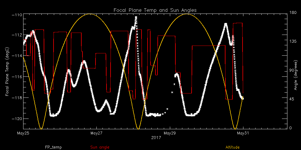 Weekly focal plane temperature with sun angle, earth angle, and altitude overplotted. Sun angle is the solar array angle, that is the angle between the sun and the optical axis (+X axis). The earth angle is the angle between earth and the ACIS radiator (+Z axis). Altitude varies from 34 kkm to 128 kkm.