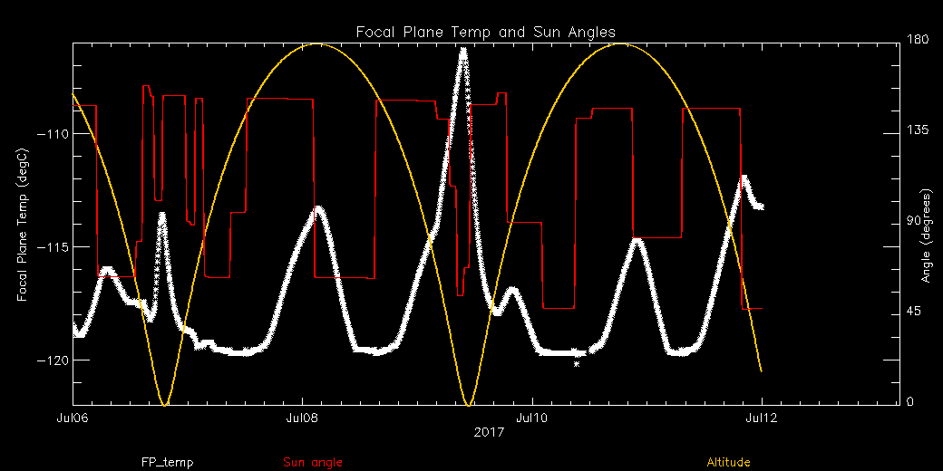 Weekly focal plane temperature with sun angle, earth angle, and altitude overplotted. Sun angle is the solar array angle, that is the angle between the sun and the optical axis (+X axis). The earth angle is the angle between earth and the ACIS radiator (+Z axis). Altitude varies from 34 kkm to 128 kkm.