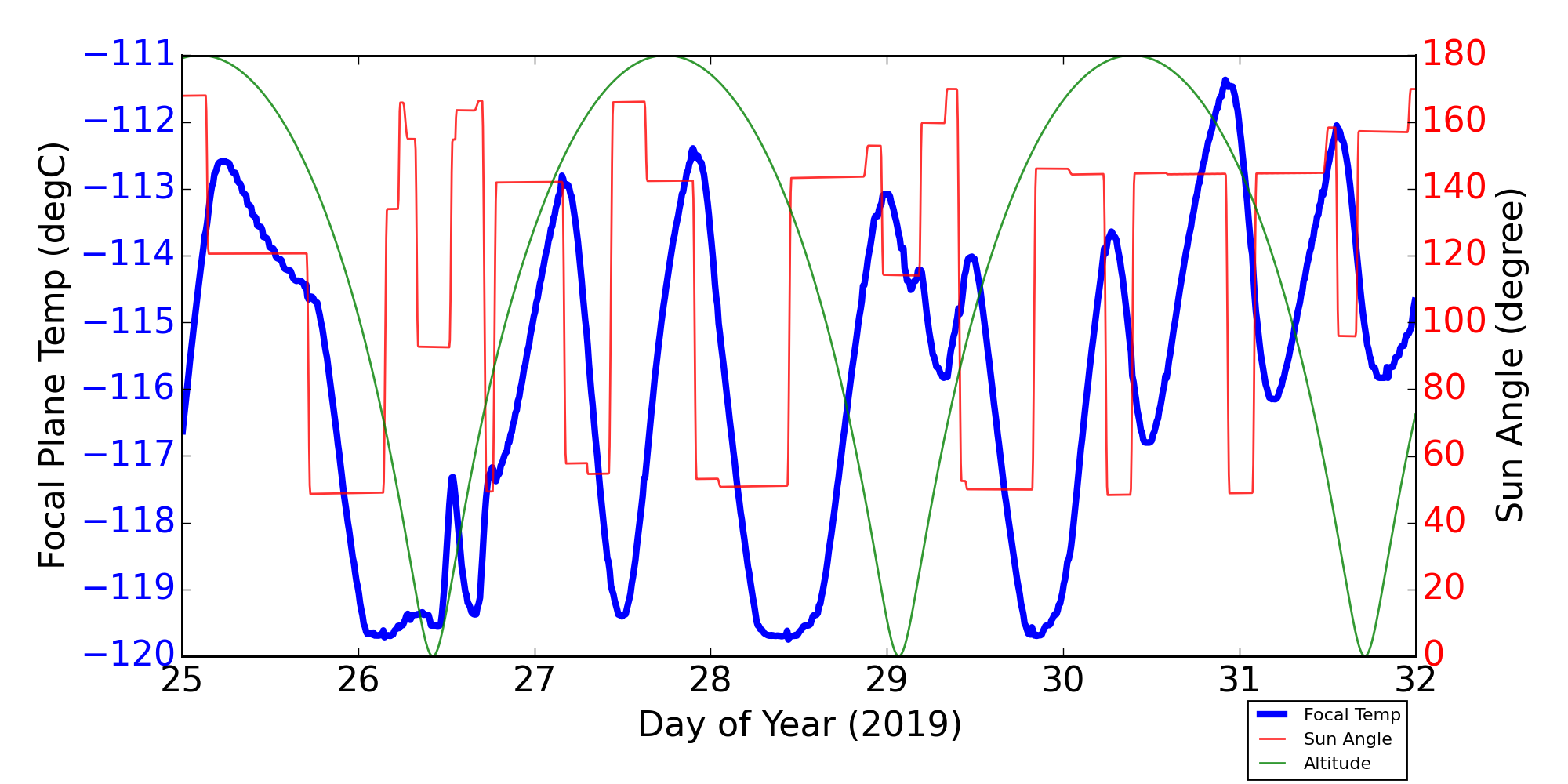 Weekly focal plane temperature with sun angle, earth angle, and altitude overplotted. Sun angle is the solar array angle, that is the angle between the sun and the optical axis (+X axis). The earth angle is the angle between earth and the ACIS radiator (+Z axis). Altitude varies from 34 kkm to 128 kkm.