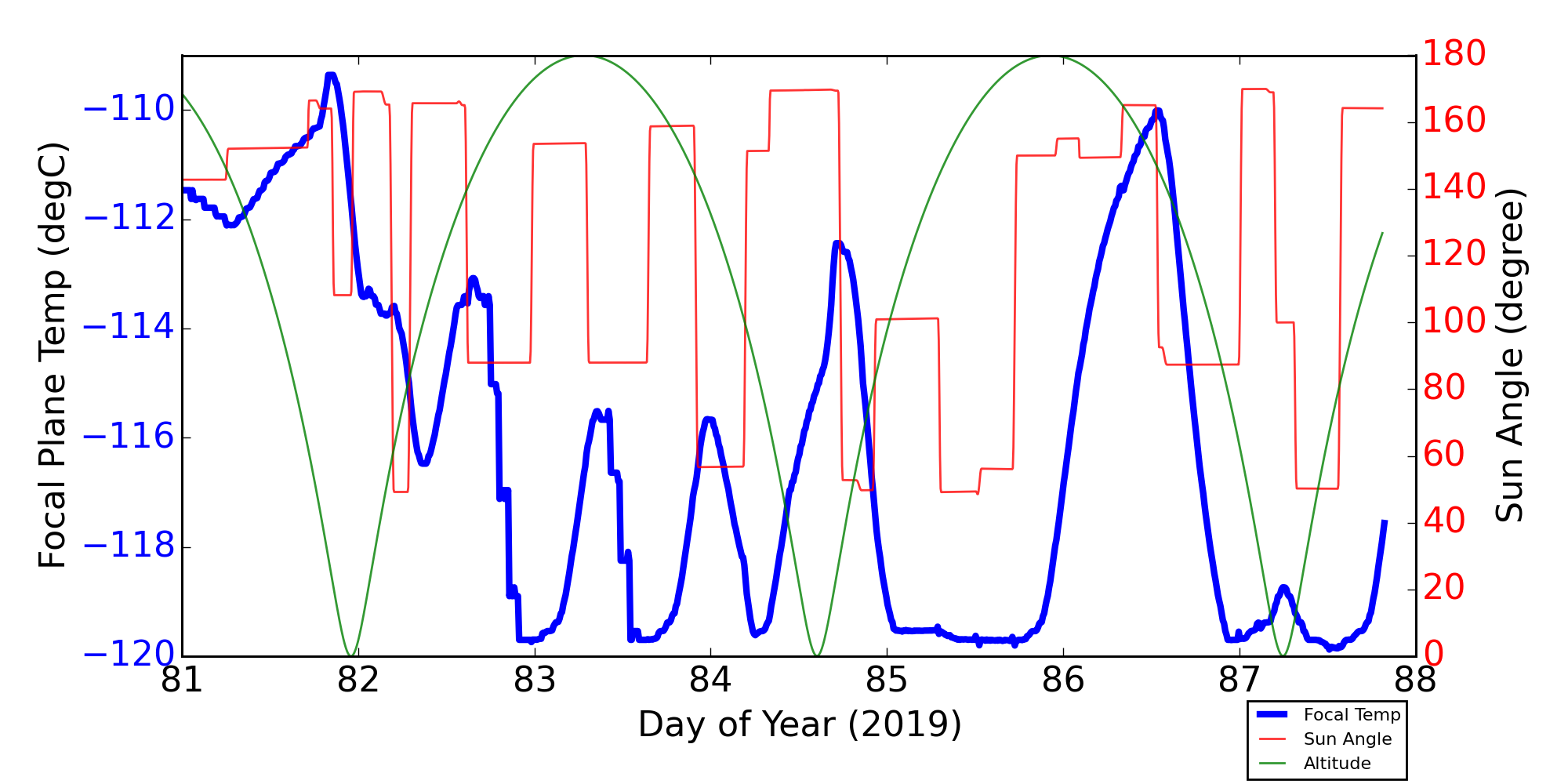Weekly focal plane temperature with sun angle, earth angle, and altitude overplotted. Sun angle is the solar array angle, that is the angle between the sun and the optical axis (+X axis). The earth angle is the angle between earth and the ACIS radiator (+Z axis). Altitude varies from 34 kkm to 128 kkm.