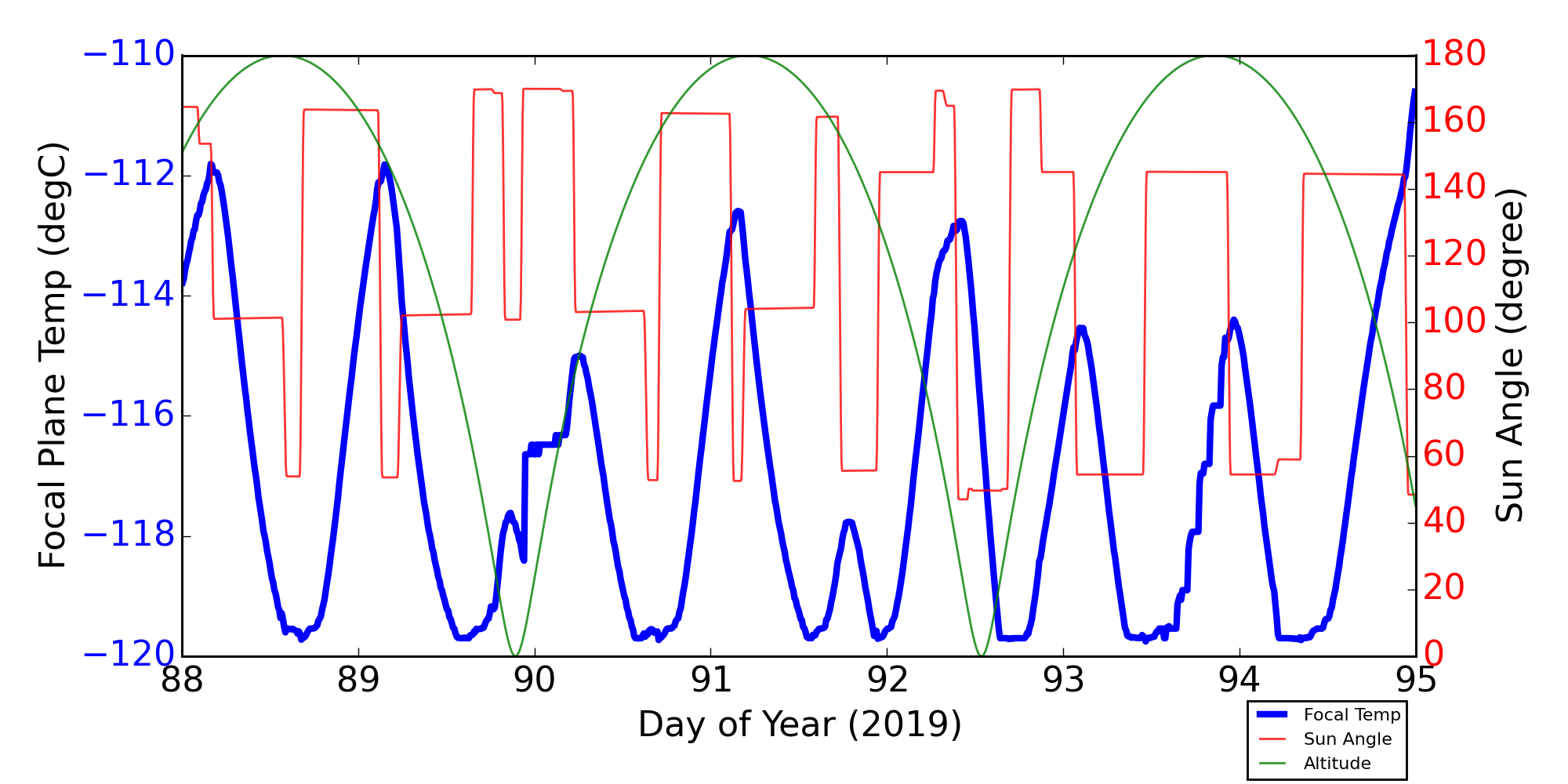 Weekly focal plane temperature with sun angle, earth angle, and altitude overplotted. Sun angle is the solar array angle, that is the angle between the sun and the optical axis (+X axis). The earth angle is the angle between earth and the ACIS radiator (+Z axis). Altitude varies from 34 kkm to 128 kkm.