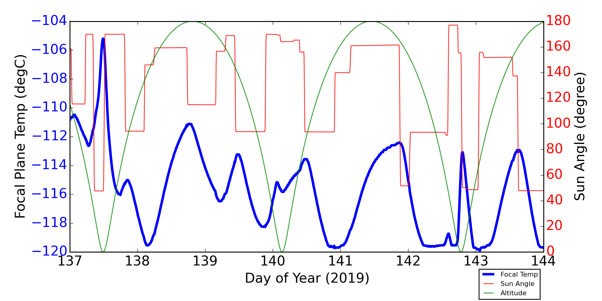 Weekly focal plane temperature with sun angle, earth angle, and altitude overplotted. Sun angle is the solar array angle, that is the angle between the sun and the optical axis (+X axis). The earth angle is the angle between earth and the ACIS radiator (+Z axis). Altitude varies from 34 kkm to 128 kkm.