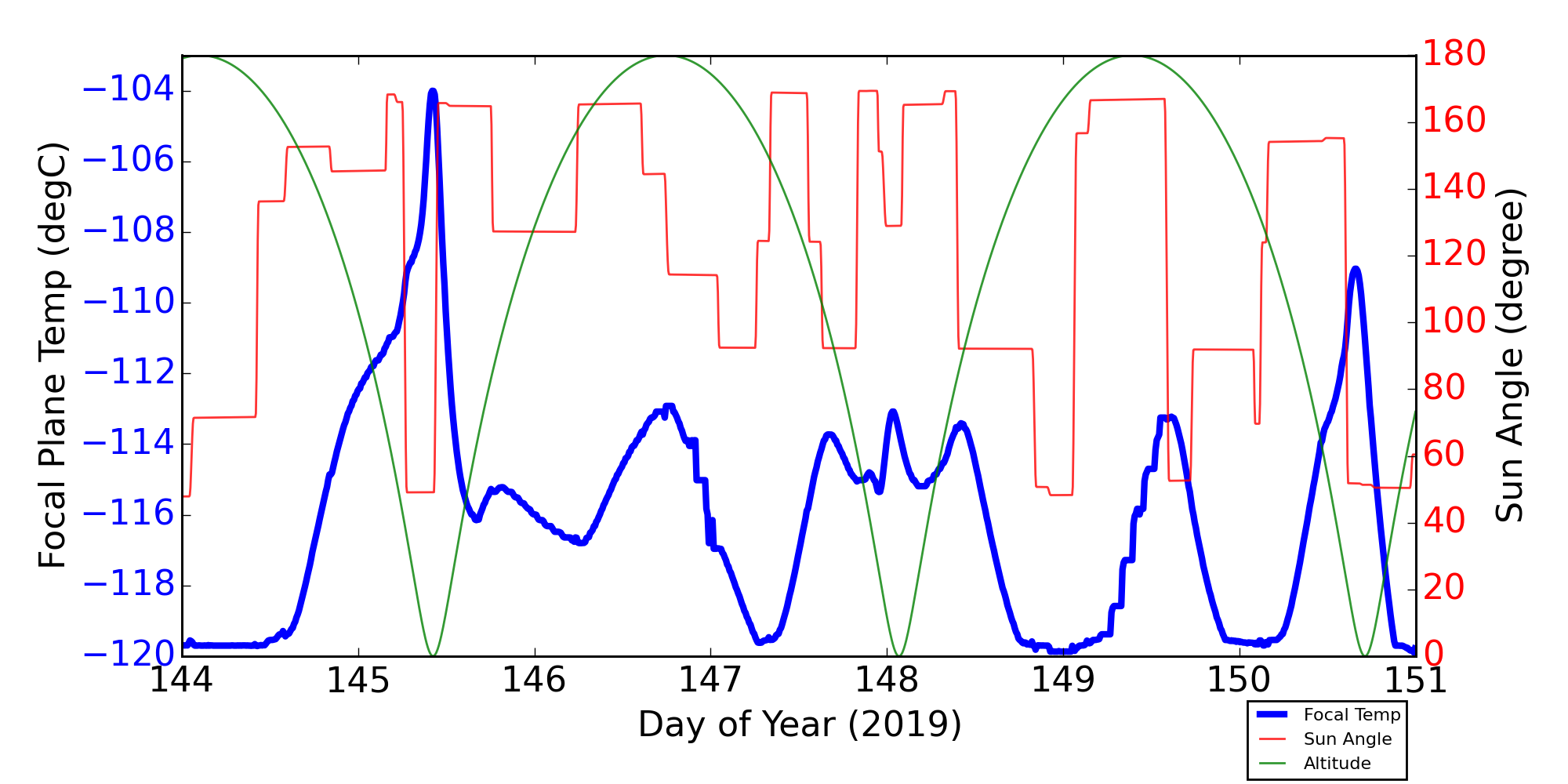 Weekly focal plane temperature with sun angle, earth angle, and altitude overplotted. Sun angle is the solar array angle, that is the angle between the sun and the optical axis (+X axis). The earth angle is the angle between earth and the ACIS radiator (+Z axis). Altitude varies from 34 kkm to 128 kkm.