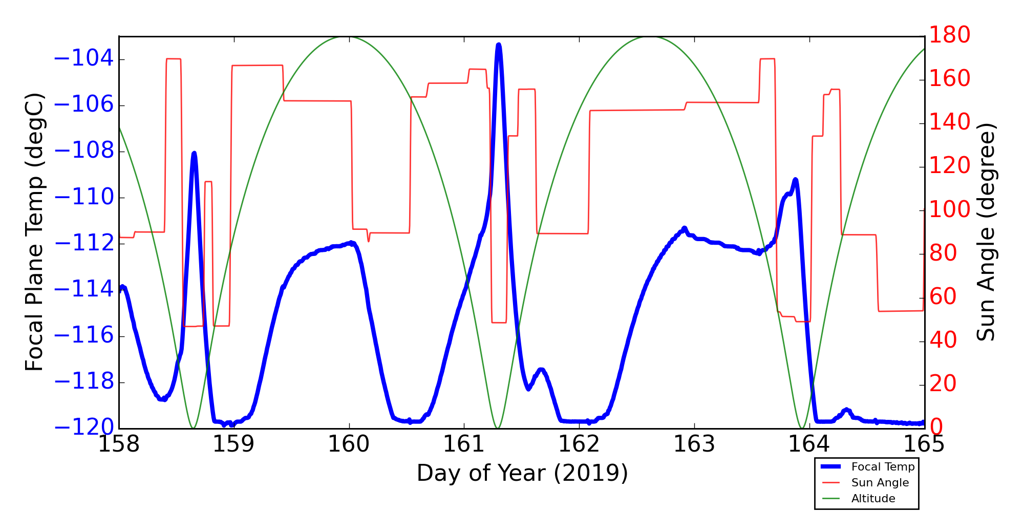 Weekly focal plane temperature with sun angle, earth angle, and altitude overplotted. Sun angle is the solar array angle, that is the angle between the sun and the optical axis (+X axis). The earth angle is the angle between earth and the ACIS radiator (+Z axis). Altitude varies from 34 kkm to 128 kkm.