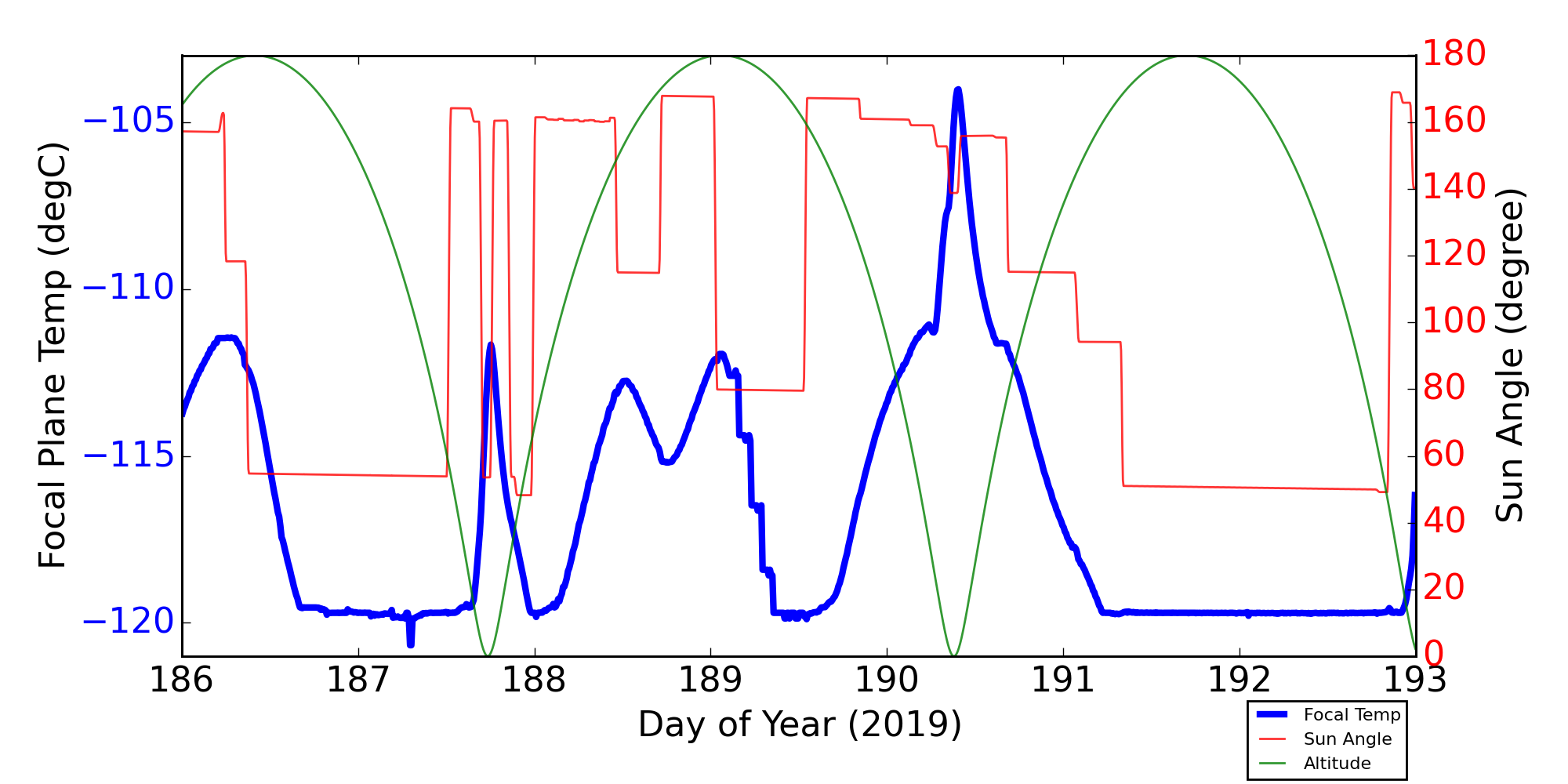 Weekly focal plane temperature with sun angle, earth angle, and altitude overplotted. Sun angle is the solar array angle, that is the angle between the sun and the optical axis (+X axis). The earth angle is the angle between earth and the ACIS radiator (+Z axis). Altitude varies from 34 kkm to 128 kkm.