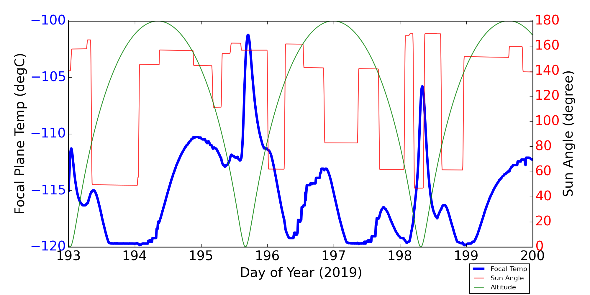 Weekly focal plane temperature with sun angle, earth angle, and altitude overplotted. Sun angle is the solar array angle, that is the angle between the sun and the optical axis (+X axis). The earth angle is the angle between earth and the ACIS radiator (+Z axis). Altitude varies from 34 kkm to 128 kkm.
