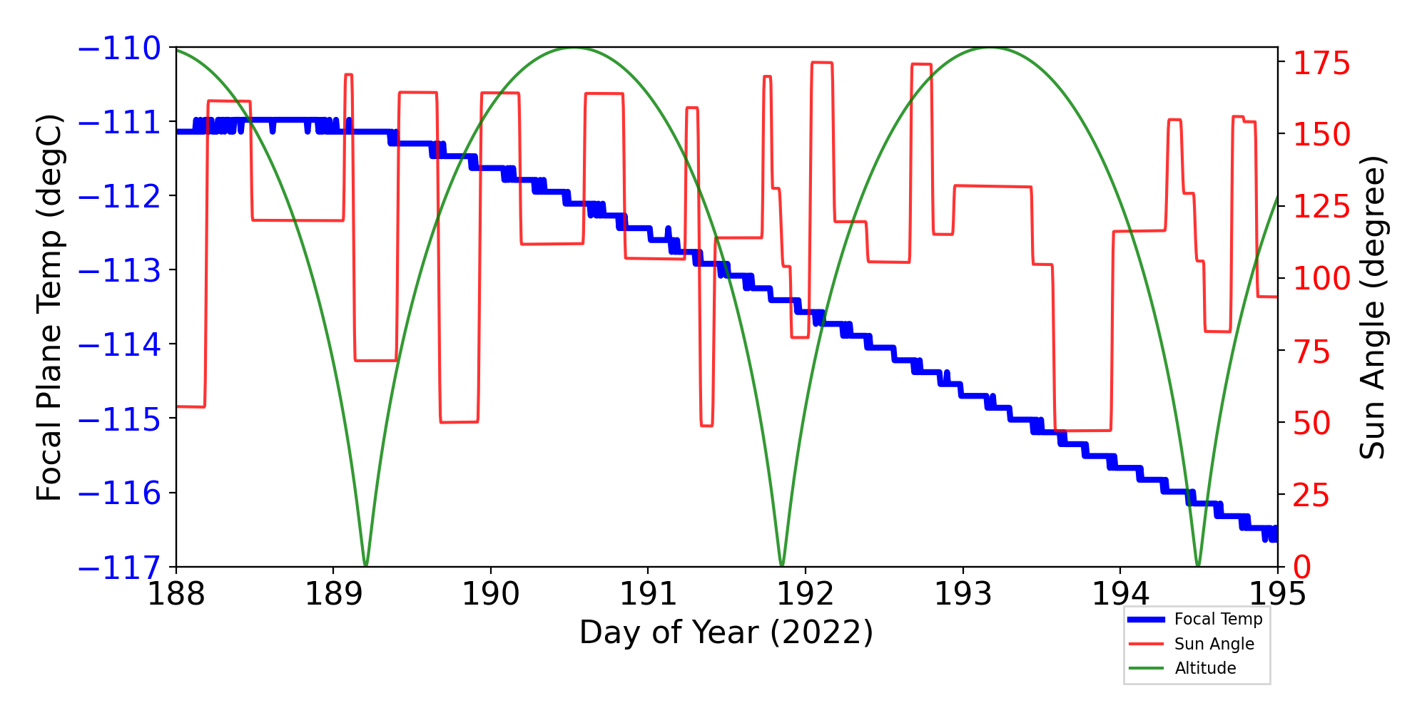 Weekly focal plane temperature with sun angle, earth angle, and altitude overplotted. Sun angle is the solar array angle, that is the angle between the sun and the optical axis (+X axis). The earth angle is the angle between earth and the ACIS radiator (+Z axis). Altitude varies from 34 kkm to 128 kkm.