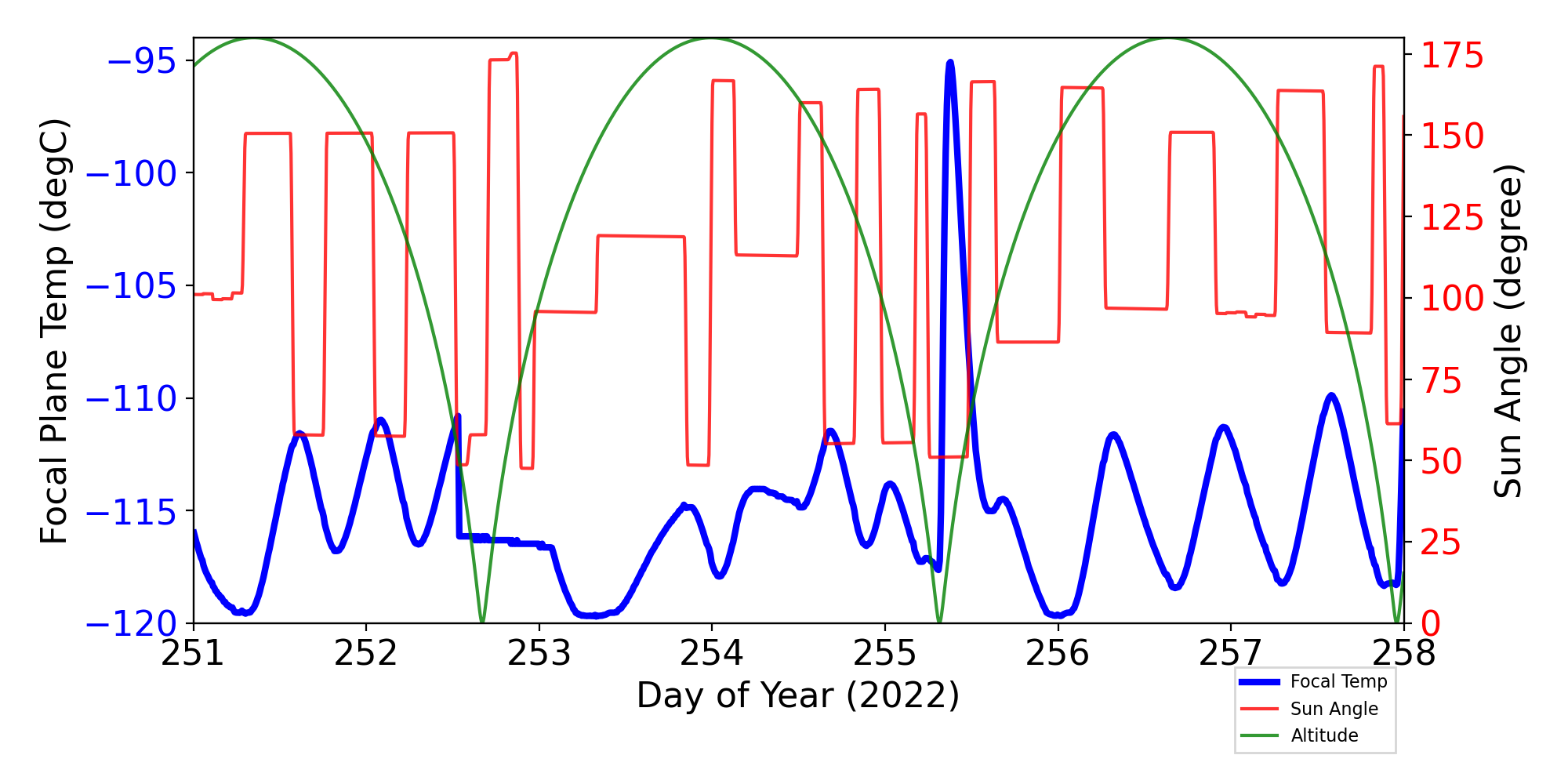Weekly focal plane temperature with sun angle, earth angle, and altitude overplotted. Sun angle is the solar array angle, that is the angle between the sun and the optical axis (+X axis). The earth angle is the angle between earth and the ACIS radiator (+Z axis). Altitude varies from 34 kkm to 128 kkm.
