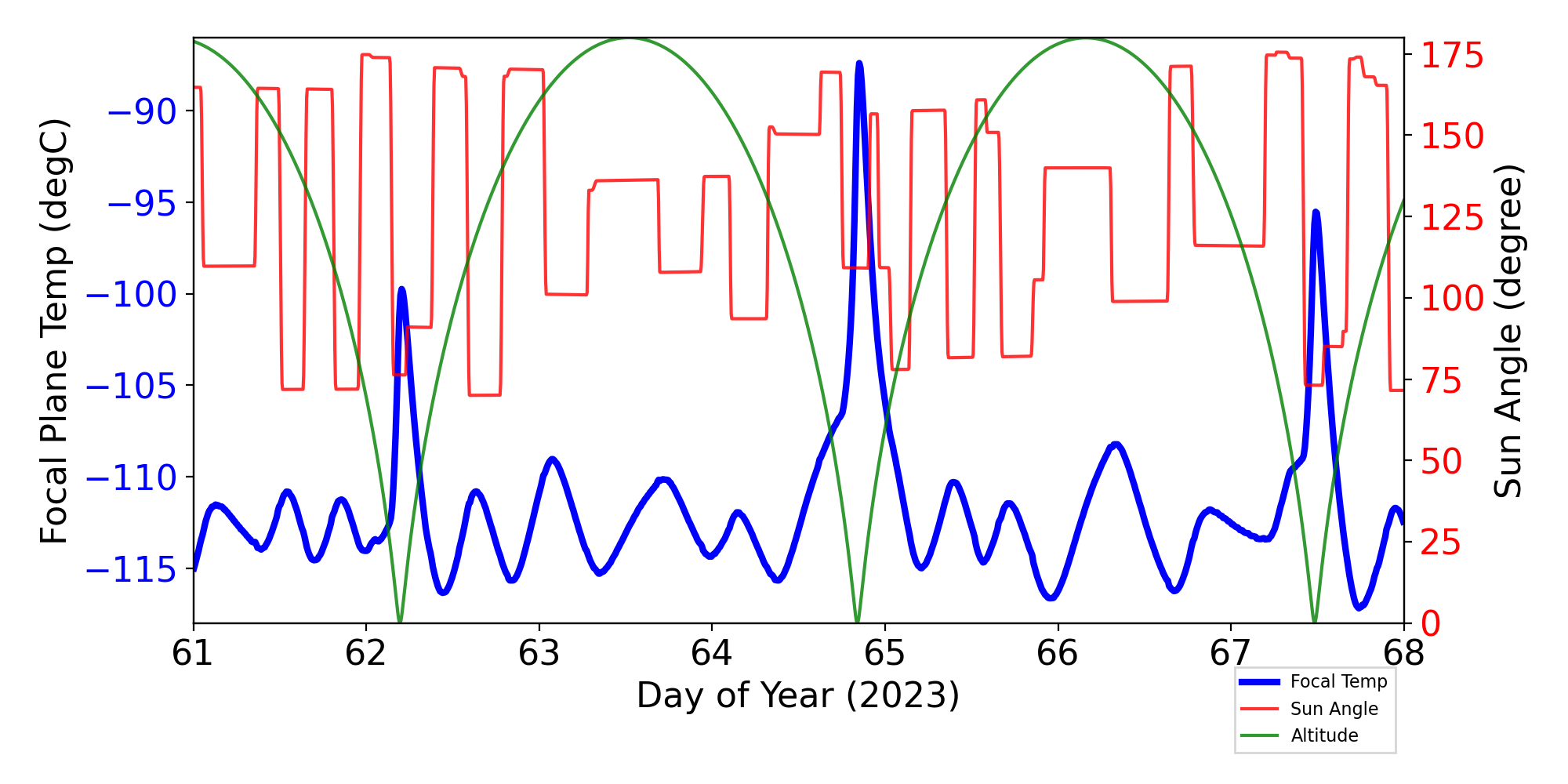 Weekly focal plane temperature with sun angle, earth angle, and altitude overplotted. Sun angle is the solar array angle, that is the angle between the sun and the optical axis (+X axis). The earth angle is the angle between earth and the ACIS radiator (+Z axis). Altitude varies from 34 kkm to 128 kkm.