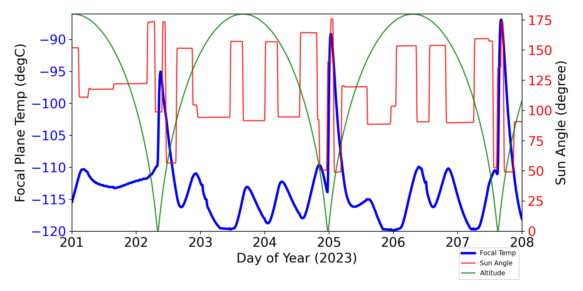 Weekly focal plane temperature with sun angle, earth angle, and altitude overplotted. Sun angle is the solar array angle, that is the angle between the sun and the optical axis (+X axis). The earth angle is the angle between earth and the ACIS radiator (+Z axis). Altitude varies from 34 kkm to 128 kkm.