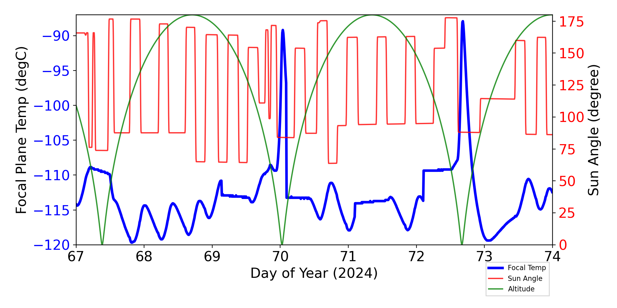 Weekly focal plane temperature with sun angle, earth angle, and altitude overplotted. Sun angle is the solar array angle, that is the angle between the sun and the optical axis (+X axis). The earth angle is the angle between earth and the ACIS radiator (+Z axis). Altitude varies from 34 kkm to 128 kkm.