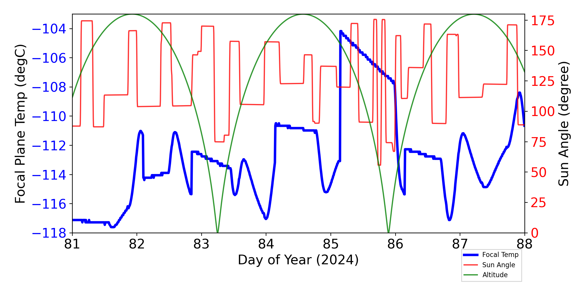 Weekly focal plane temperature with sun angle, earth angle, and altitude overplotted. Sun angle is the solar array angle, that is the angle between the sun and the optical axis (+X axis). The earth angle is the angle between earth and the ACIS radiator (+Z axis). Altitude varies from 34 kkm to 128 kkm.